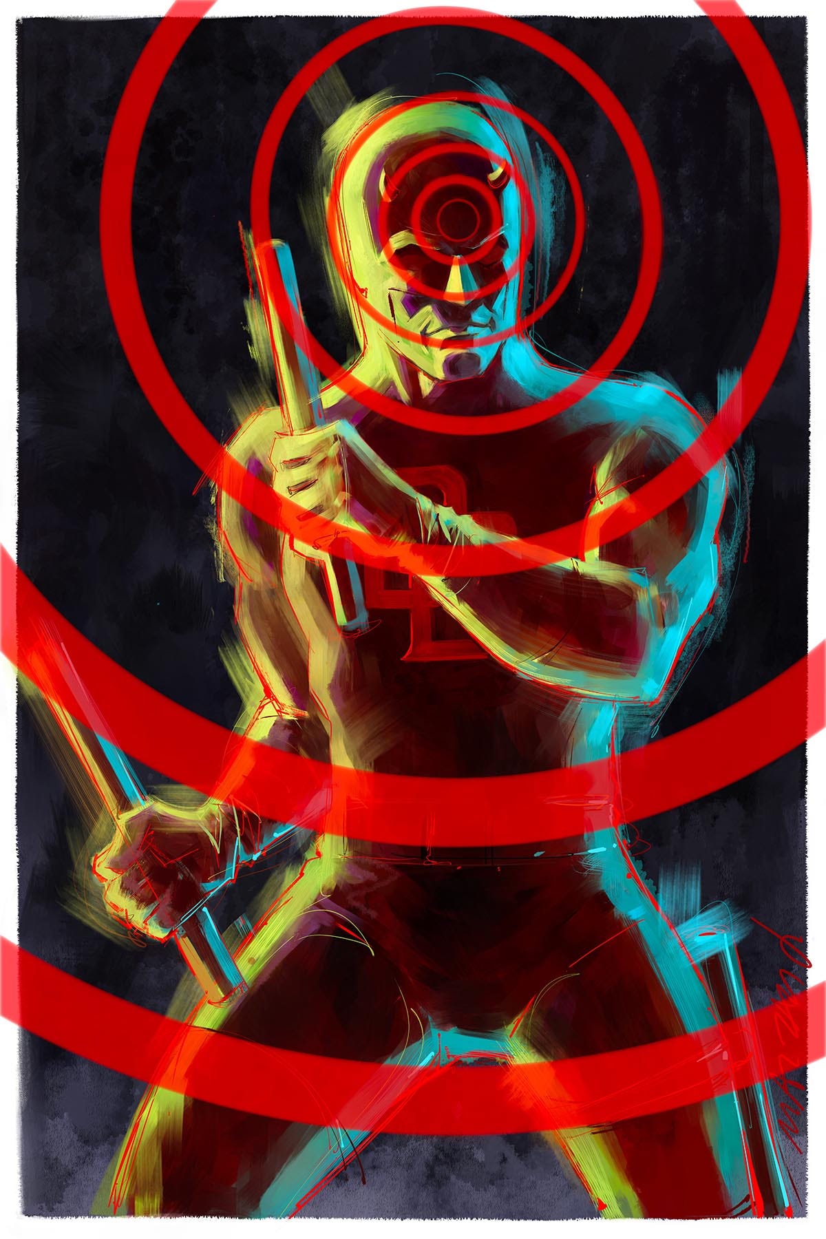 Anyway, enough complaining about that stuff. Here’s Daredevil. A few hours with Painter and Clip Studio. Still playing with the abstraction and searching line idea, and maybe I’ll push it some more in that direction later. In the meantime, this image will be available as a print at my upcoming appearances at the Infinity Toy and Comic Convention in Kissimmee, FL, and Terrificon in Uncasville, CT. It will also be available through my website store.
